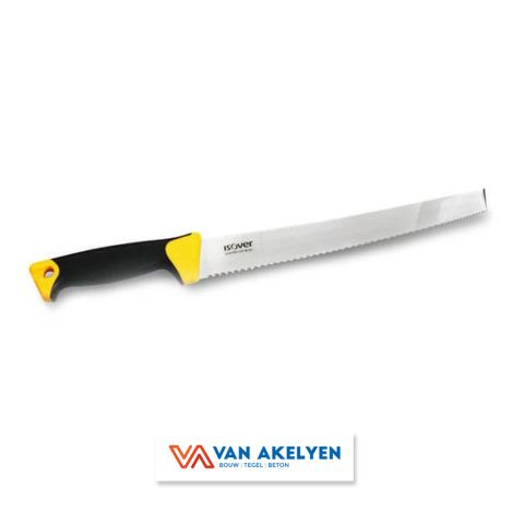 Mes met enkelzijdig lemmet, speciaal ontworpen voor het versnijden van minerale wol van het merk ISOVER. Roestvrij stalen lemmet met een lengte van 29,7 cm.